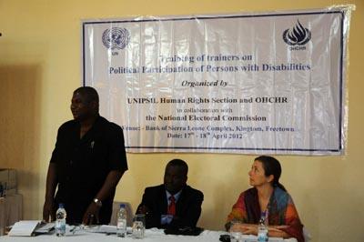On 17 and 18 April 2012, the United Nations Integrated Peacebuilding Office in Sierra Leone (UNIPSIL) organized a training of trainers on political participation of persons with disabilities at the Bank of Sierra Leone Complex, Kingtom. The programme was developed by the Human Rights Section of UNIPSIL in collaboration with the Directorate for Training of NEC, and funded by the Office of the High Commissioner for Human Rights (OHCHR).