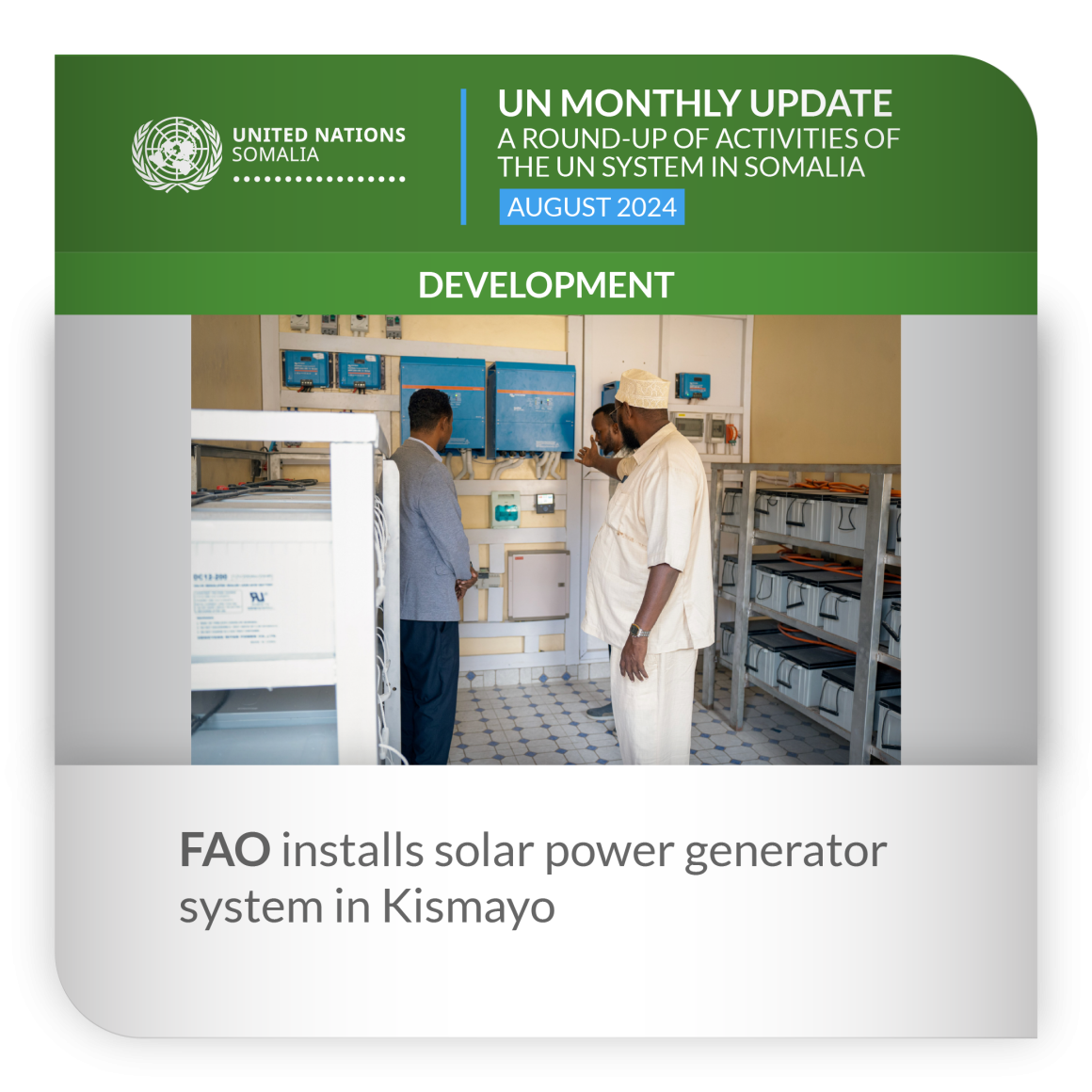 ![]() | Development | FAO installs solar power generator system in Kismayo FAO installed a state-of-the-art solar power generator system at the fish market in Kismayo, city of Jubaland, for the benefit of the local community and to enhance market efficiency. The system is part of FAO’s RAAISE project, which falls under the European Union’s ‘Inclusive Local and Economic Development’ programme. The latter aims to contribute to stability in Somalia by extending state authority and services, promoting local reconciliation and peacebuilding, creating inclusive economic opportunities and protecting the most vulnerable. According to FAO, the innovative generator system provides sustainable and reliable energy essential for maintaining fish quality and supporting local livelihoods. RAAISE, which stands for ‘Resilient Fisheries and Livestock Value Chain for Inclusive and Sustainable Growth in Somalia,’ is designed to enhance resilience against climate variability and conflict by improving institutional capacities, value chain development, and regulatory frameworks across Somalia. | |