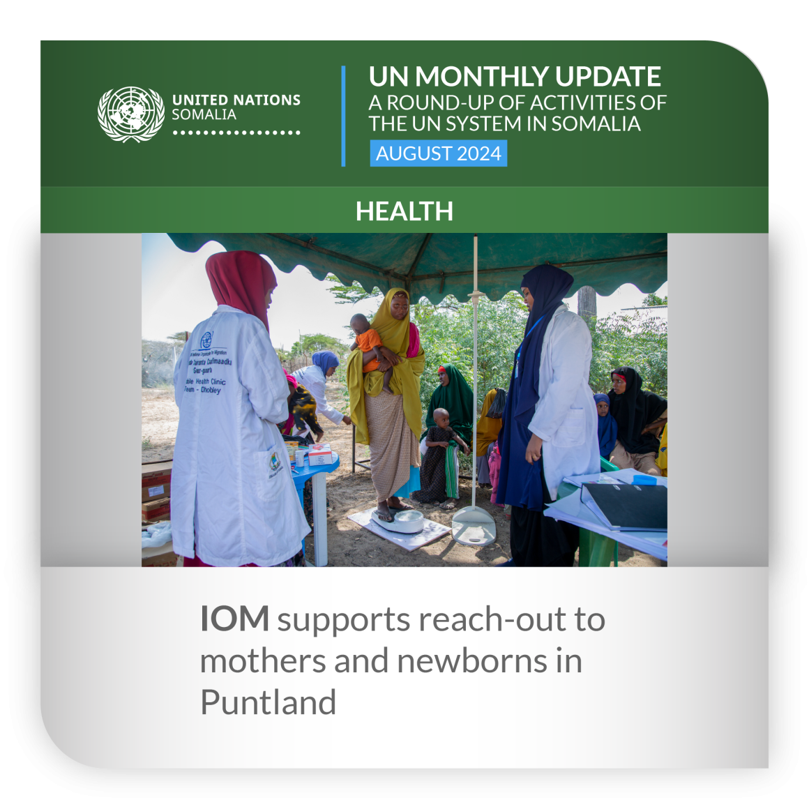 ![]() | Health | IOM supports reach-out to mothers and newborns in Puntland In Garowe, the capital of Puntland, IOM and the Federal Member State’s Ministry of Health worked together to overcome geographical barriers and deliver essential healthcare services directly to displaced populations. Through seven mobile clinics, IOM provided critical medical care to the communities of Burtinle, Dan Gorayo, Xamur, Abaarey, Garowe, Godobjiran and Jariban, with a focus on post-natal care. Since the launch of the first mobile clinic in May 2013, IOM has reached thousands of Somalis with services including routine consultation, maternal health, nutrition and immunizations. According to IOM, vehicles equipped with essential medical supplies, and staffed by dedicated healthcare professionals, bring vital infant and young child feeding services directly to the heart of underserved communities. | |