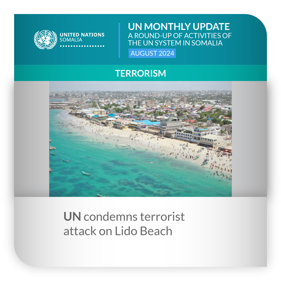 ![]() | Terrorism | UN condemns terrorist attack on Lido Beach The United Nations in Somalia strongly condemned the Al-Shabaab terrorist attack that took place at Mogadishu’s Lido Beach in early August, reportedly killing at least 32 people and injuring many more. In a statement, the United Nations in Somalia expressed its deepest condolences to the families of the victims and wished a speedy recovery for the injured. “Lido Beach is a popular place for Somalis to spend time with family and friends and enjoy the beauty of the Somali coastline. Targeting this location is an abhorrent act that warrants the firmest condemnation,” the UN Secretary-General’s Acting Special Representative for Somalia, James Swan, said in a statement. “As we join all peace-loving Somalis in mourning this sad loss, I reaffirm the United Nations’ support for and solidarity with the Federal Government of Somalia in its efforts to ensure peace, security, and stability in the country,” he added. | |