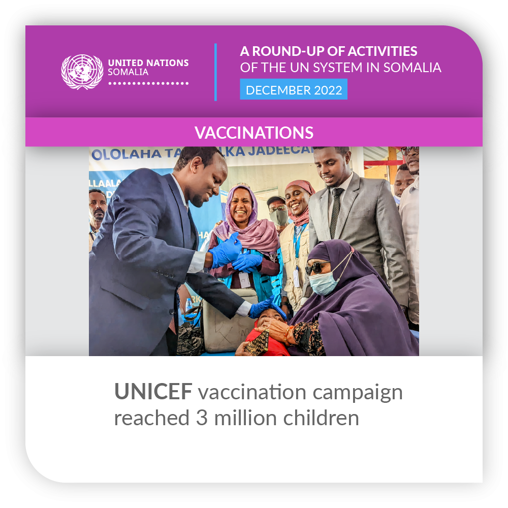 ![]() | Vaccinations | UNICEF vaccination campaign reached 3 million children In November, the Ministry of Health and Human Services, World Health Organisation (WHO) and United Nations Children’s Fund (UNICEF) conducted an integrated nationwide campaign that resulted in vaccinating over 2.3 million children aged 6 – 59 months against measles to prevent disease outbreaks that are more frequent during droughts such as Somalia is experiencing. During the 5-day campaign, 2.6 million children received vaccinations against polio, vitamin A supplementation and deworming medication. The campaign comes against a backdrop of drastically increased measles cases in 2022 (16,880) compared to 2021 (7,494). For the November campaign, UNICEF delivered over 3.5 million doses of measles and polio vaccines and over 3 million doses of vitamin A and deworming tablets while providing technical support to the Ministry of Health on cold chain and vaccine management. UNICEF also supported the social mobilisation network (SOMNET) to accelerate awareness of the campaign and increase vaccine uptake. | |