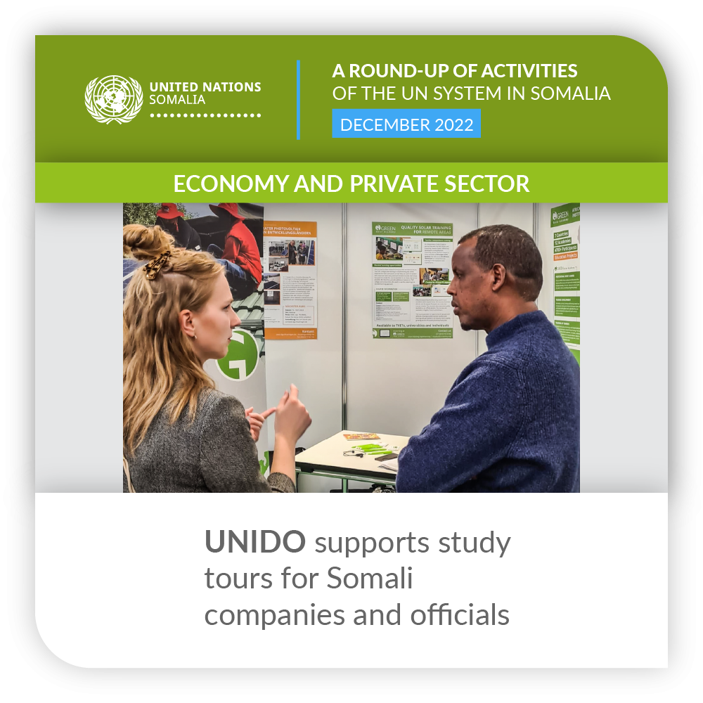 ![]() | Economy and private sector | UNIDO supports study tours for Somali companies and officials Officials of the Ministry of Commerce and Industry (MoCI) of the Federal Government of Somalia (FGS) travelled to Italy, supported by United Nations Industrial Development Organisation (UNIDO), to meet their European counterparts, including business associations, financial institutions, and the Italian Trade Agency. Separately, a group of Somali entrepreneurs participated in a two-day off-grid renewable energy systems exhibition in Germany, which focused on wind and hydropower systems. This was an opportunity to source clean and cheap energy. Furthermore, the Somali entrepreneurs toured a dairy/biogas farm and companies providing cooling solutions for the fishery, drip irrigation, water pumps and borehole drilling. Most importantly, the Somali companies engaged with their German counterparts in B2B, which allowed for knowledge exchange while talks were ongoing for possible technology sourcing. | |