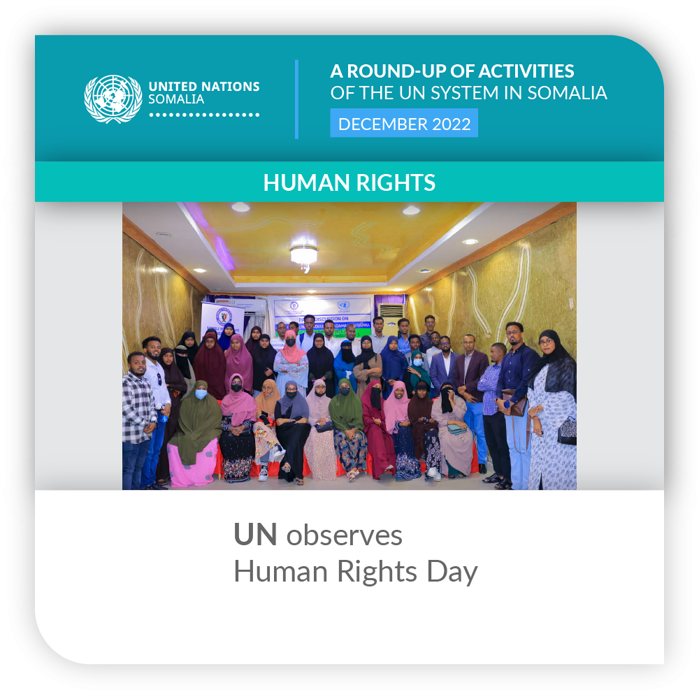 ![]() | Human rights | UN observes Human Rights Day In a statement marking the Human Rights Day 2022, the UN Deputy Special Representative, Anita Kiki Gbeho, said that Somalia has, and continues to make significant achievements to promote and protect human rights, including those rights enshrined in the Provisional Constitution, which guarantees rights and freedoms for all Somalis. The United Nations in Somalia remains committed to supporting Somalia’s efforts to promote and protect human rights for the benefit of the Somali people. Read the complete statement here. As part of activities marking Human Rights Day, the Somali Youth Civic Organisation (SYCO) organised panel discussions in Mogadishu, Afgoye and Beledweyne. Supported by the UN, the events brought together some 150 women, men, elders, youth, persons with disabilities, minority groups and business community representatives who discussed critical challenges in promoting human rights in Somalia. Participants highlighted the importance of finding ways to prevent human rights violations; they discussed the role of the government, civil society, and international bodies in improving the situation of human rights in Somalia. | |