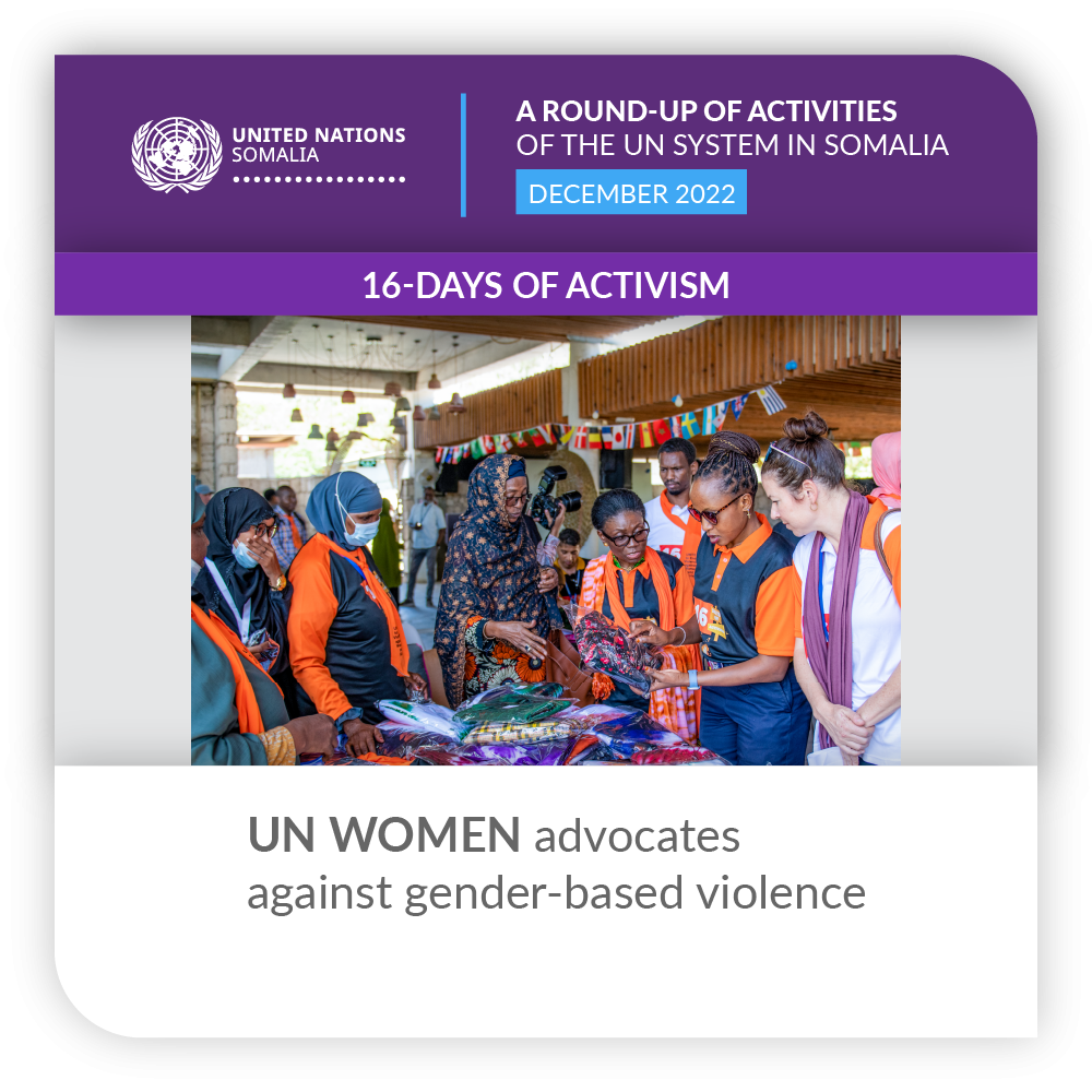 ![]() | 16-Days of Activism | UN Women advocate against gender-based violence UN Women Somalia spearheaded the 16 Days of Activism against Gender-Based Violence campaign under the theme “Unite to end violence against women and girls” to strengthen and galvanise gender mainstreaming in Somalia. This year, during the campaign, men and women championing women’s rights have committed to increasing advocacy efforts to prevent violence against women and girls. UN Women Somalia supported businesswomen and owners of small businesses such as restaurants, handicrafts and tailoring by giving them a platform to exhibit their products and skills and meet and showcase their ideas with the international community.√ | |