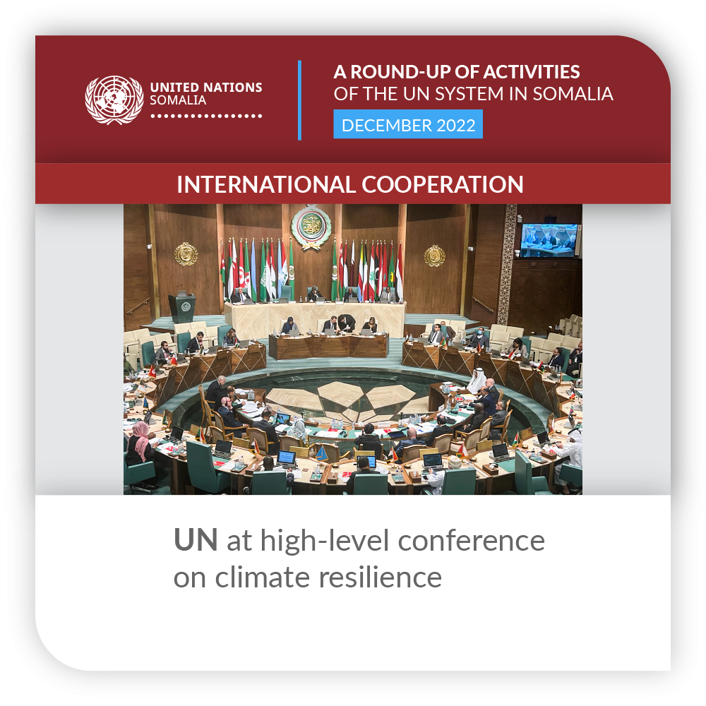 ![]() | International Cooperation | UN at high-level conference on climate resiience On 6 December, the Federal Government of Somalia, the United Nations, and the League of Arab States (LAS) co-hosted a high-level conference on drought and climate resilience in Somalia. Held in Cairo, Egypt, the conference brought together United Nations Agencies, Funds and Programmes, LAS member states, Arab NGOs, and financial institutions to respond to Somalia’s dire humanitarian conditions and climate projections. The conference focused on emergency life-saving needs and medium- and longer-term sustainability to help break the cycle of recurrent crises. | |