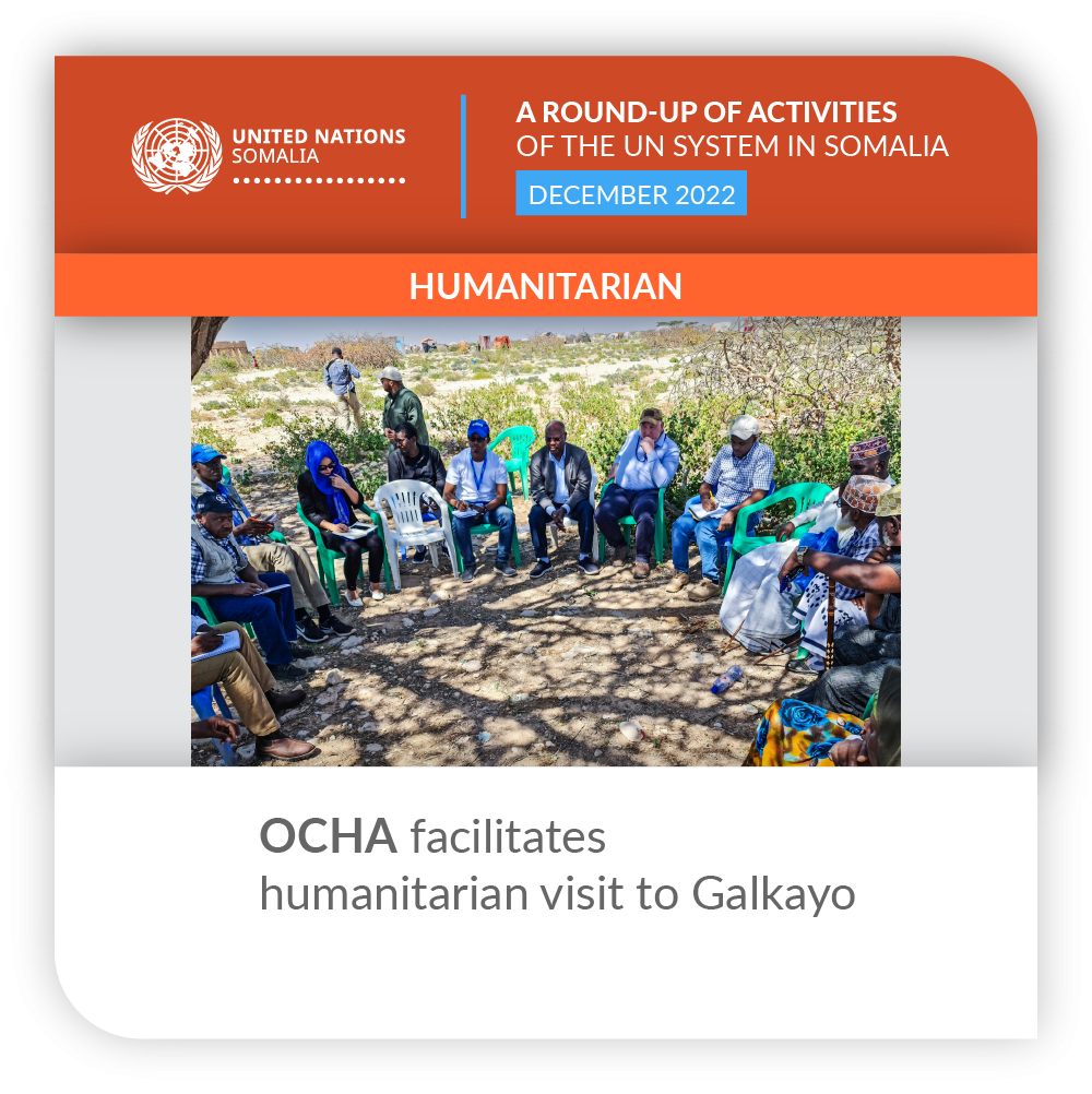 ![]() | Humanitarian | OCHA facilitates humanitarian visit to Galkayo In December, the UN Office for the Coordination of Humanitarian Affairs (OCHA) facilitated the visit of the Humanitarian Coordinator and OCHA Head of Office to Galkayo to assess the humanitarian situation and the ongoing response. The mission met with partners, authorities and people affected by the drought in Degaab and Ayah displacement sites in north and south Galkayo and discussed collective efforts to ramp up operations urgently. Partners informed the Humanitarian Coordinator that frontloaded funding is critical as the country enters the dry Jilaal season in January when humanitarian needs are expected to increase. More than 180,000 people are displaced in this area due to drought and ongoing conflict. | |