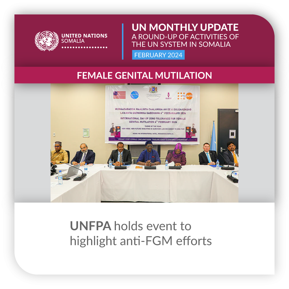 ![]() | Female Genital Mutilation | UNFPA holds event to highlight anti-FGM efforts Organized with the Federal Ministry of Women and Human Rights Development (MWHRD), UNFPA held an event in Mogadishu to mark the International Day of Zero Tolerance for Female Genital Mutilation (FGM), which falls on 6 February annually. Bringing together Somali and international stakeholders, the gathering’s attendees emphasized the urgency of eradicating FGM, with a joint declaration reaffirming commitment to this cause. Speakers also highlighted the health impacts of FGM and called for improved care for survivors, and the event served as a launch for a coordination forum to combat FGM and Child, Early, and Forced Marriage. | |