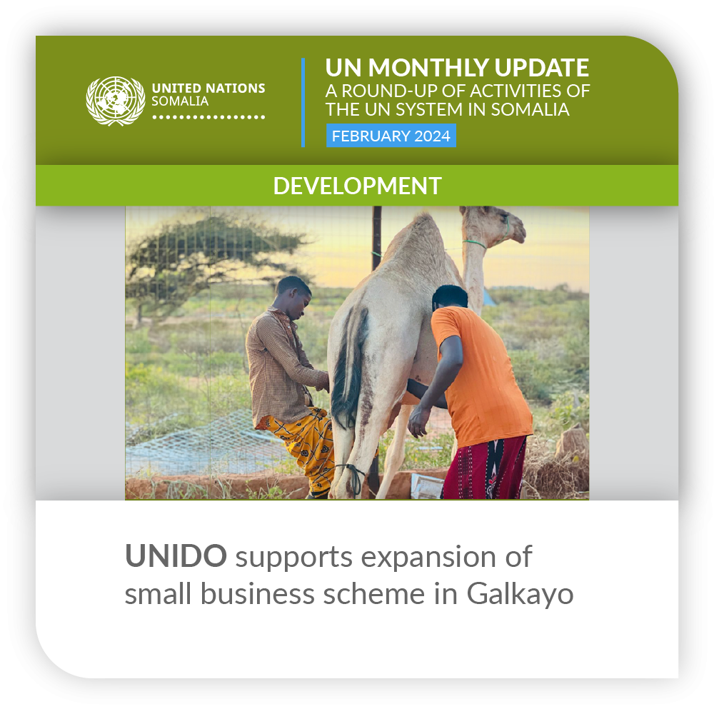 ![]() | Development | UNIDO supports expansion of small business scheme in Galkayo UNIDO provided more than 60 local entrepreneurs in the city of Galkayo, in Galmudug, with training and one-on-one counselling on developing their business ideas into existing businesses. The move follows the expansion of UNIDO’s Enterprise Development Unit. Related to the expansion, UNIDO – in partnership with UNDP – has also expanded the credit facility operated by IBS Bank. Now, local entrepreneurs can access investment loans for amounts between $5,000 and $30,000 for projects involving the critical sectors of livestock, agriculture, construction and manufacturing. | |