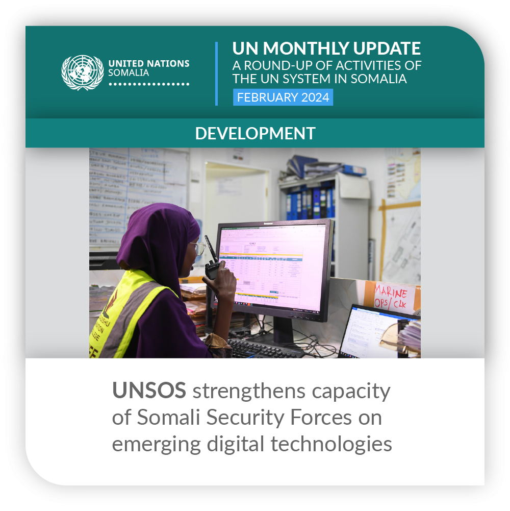![]() | Development | UNSOS strengthens capacity of Somali Security Forces on emerging digital technologies UNSOS provided 28 personnel from the Somali Security Forces with training on digital technologies. The Business Relationship Management and Digital Transformation Workshop sought to identify their operational pain points and provide innovative technological solutions to resolve these. Speaking at the event, the Head of UNSOS, Assistant Secretary-General Aisa Kirabo Kacyira, emphasized the UN’s commitment to leaving behind more technology-aware Somali Security Forces which are capable of supporting their country’s institutions for a more resilient Somali community. “I am here to serve and to leave a legacy,” she said. “We want to leave behind a stronger team, a stronger Somalia community, and most importantly, stronger Somali Security Forces. |