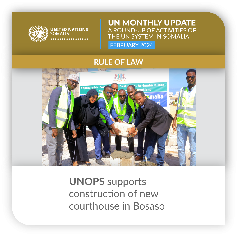![]() | Rule of Law | UNOPS supports construction of new courthouse in Bosaso UNOPS supported the groundbreaking ceremony for a building which is set to become the Bosaso Courthouse Complex in Puntland, in northern Somalia – another step towards strengthening the country's rule of law. Attended by government officials, the event highlighted the crucial role of the new courthouse in improving access to justice and legal services. The project involves constructing a modern courthouse complex with enhanced security measures and modern amenities, including an appeal courtroom and office spaces. The design prioritizes accessibility and inclusivity, catering to individuals with disabilities. According to UNOPS, this initiative is expected to empower communities, ensure equity, and contribute to lasting peace and development in Somalia. | |