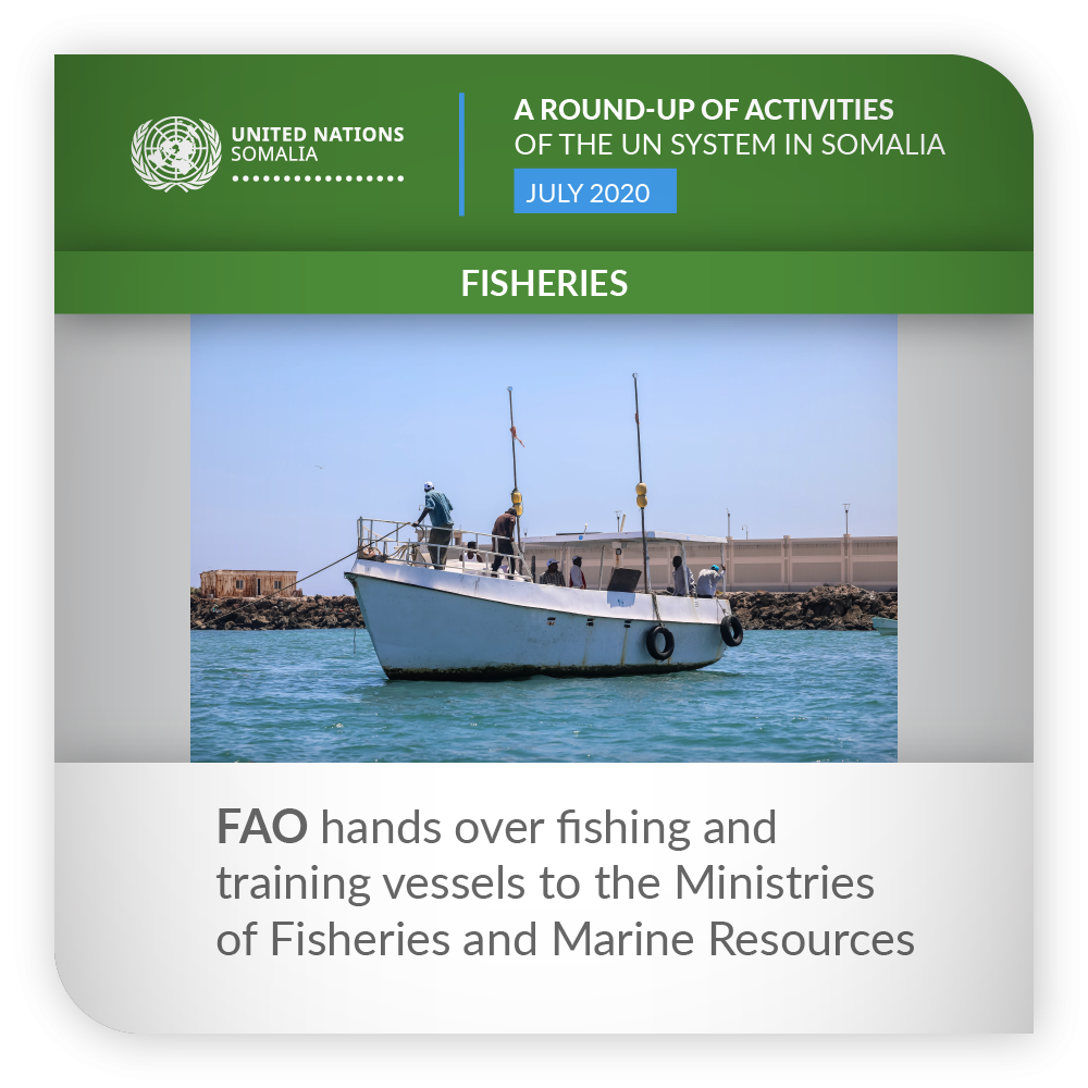 ![]() | Fisheries | FAO hands over fishing and training vessels to the Ministries of Fisheries and Marine Resources With European Union (EU) backing, FAO delivered two large fishing and training vessels to the Federal Government of Somalia and Puntland State, as part of its efforts to support the expansion of the fisheries sector and to provide decent employment opportunities for young people living in coastal areas. The handover is part of the EU-funded project ‘Coastal Communities Against Piracy,’ which the UN agency has been implementing since 2016, together with the various Ministries of Fisheries and Marine Resources across the country. Last year, FAO handed over 12 vessels to fishing co-operatives in Puntland. Two remaining large vessels will be soon completed and handed over to Galmudug and Jubaland authorities. A cornerstone of the project is the design and construction of artisanal fishing vessels that are made in Somali boatyards. These watercraft boast improved safety features, incorporating new sustainable fishing gear, heavily insulated fish storage holds and modern, fuel-efficient engines. They also provide a platform for fishing training as part of long-term capacity building to improve fishing skills, standards of on-board handling and safety, and build capacity in vessel and engine operation and maintenance. | |