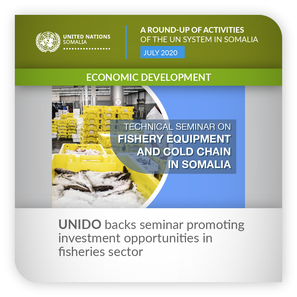 ![]() | Economic Development | UNIDO backs seminar promoting investment opportunities in fishery sector With partners, UNIDO held a ‘Technical Seminar on Fishery Equipment and Cold Chain in Somalia,’ to help advance cooperation between Somali and Italian small- to medium-sized enterprises (SMEs), with the aim of accelerating inclusive and sustainable industrial development in the country’s cold chain and fishery equipment sector. At the digital meeting, a delegation of more than 20 Somali SMEs demonstrated their business activities in the areas of production, service and trading of agro-fishery and seafood products, in order to foster potential new partnerships. As well, Italian companies and associations presented innovative solutions to their Somali counterparts, with discussions on areas such as technological upgrades in the Somali fishery equipment sector and fish processing, conservation and supply chain, alternative fishing models, advanced boat engines, efficient systems for the production and packaging of fishing nets and quality refrigeration in the frozen-food industry. The international participants included Federpesca, Consorzio Pescato Procidano, Consorzio Sviluppo ittico toscano, Mediterranea Reti, AS Labruna, Assoittica Italia, Movinox, New Cold System, and Self Globe. | |