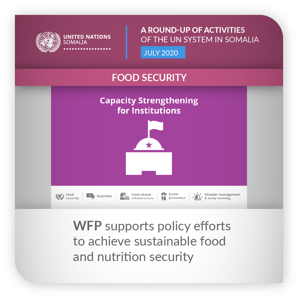 ![]() | Food security | WFP supports policy efforts to achieve sustainable food and nutrition security In addition to providing lifesaving and lifechanging assistance to vulnerable Somalis, WFP has been working with the Federal Government of Somalia on policies, systems-building and operational capacities to improve efforts in the areas of food security, nutrition, social protection, resilience, disaster risk management and early warning systems. The UN agency undertakes this twin approach with the goal of strengthening national institutions to deliver services to food-insecure and nutritionally vulnerable people in a timely and efficient manner. | |