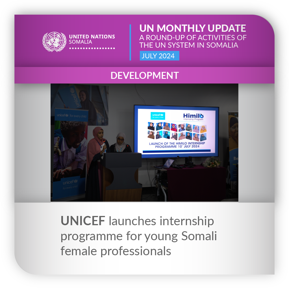 ![]() | Development | UNICEF launches internship programme for young Somali female professionals UNICEF launched the Himilo Internship Programme, which is designed to empower young Somali women with essential skills and experience, attract qualified Somali female graduates to join the UN children’s agency, improve the gender parity ratio and promote inclusivity. So far for the initiative, UNICEF has formalized partnerships with four tertiary education institutions – SIMAD University, Benadir University, Mogadishu University, and the Somali National University – through memoranda of understanding. Plans are underway to expand the partnership to other universities in Somalia, with a focus on under-represented minorities and people with disabilities. Sixteen interns have so far been selected through a competitive process that involved written assessments and interviews. According to UNICEF, the interns are not only contributing to achievement of results but are acquiring practical, hands-on skills and taking advantage of numerous online learning resources. | |