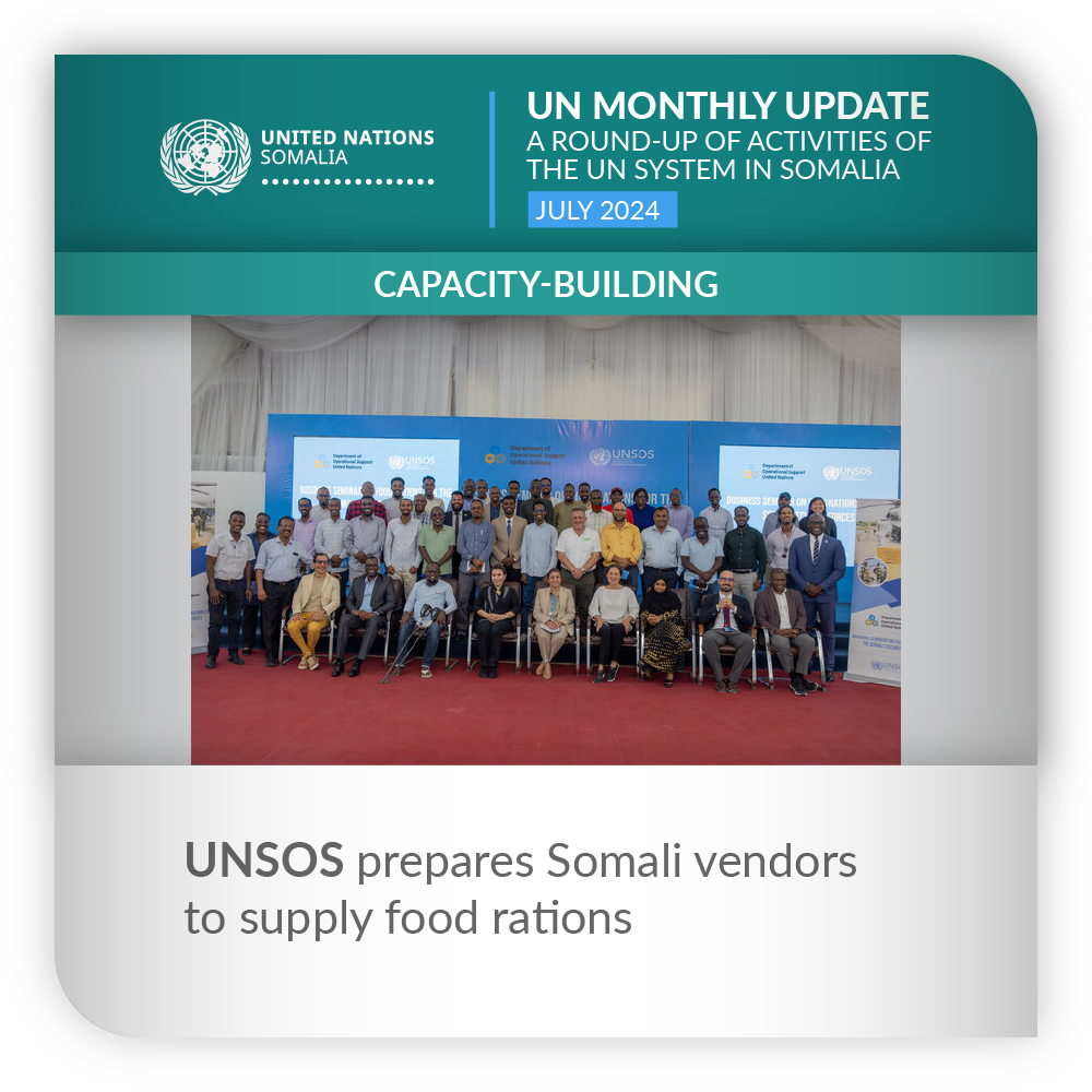 ![]() | Capacity-building | UNSOS prepares Somali vendors to supply food rations UNSOS hosted a seminar to prepare Somali-owned businesses to bid for UN contracts to supply food rations. The seminar, which attracted more than 50 local companies, was facilitated by UNSOS and the UN Department of Operational Support (DOS). It aimed at informing vendors of the requirements of UN contracts to enhance their capacity to bid; the gathering was the first-ever thematic seminar for rations jointly organized by UNSOS and DOS. In addition to raising awareness among the local vendors, the event also sought participants’ views on the UN processes to build stronger partnerships. | |