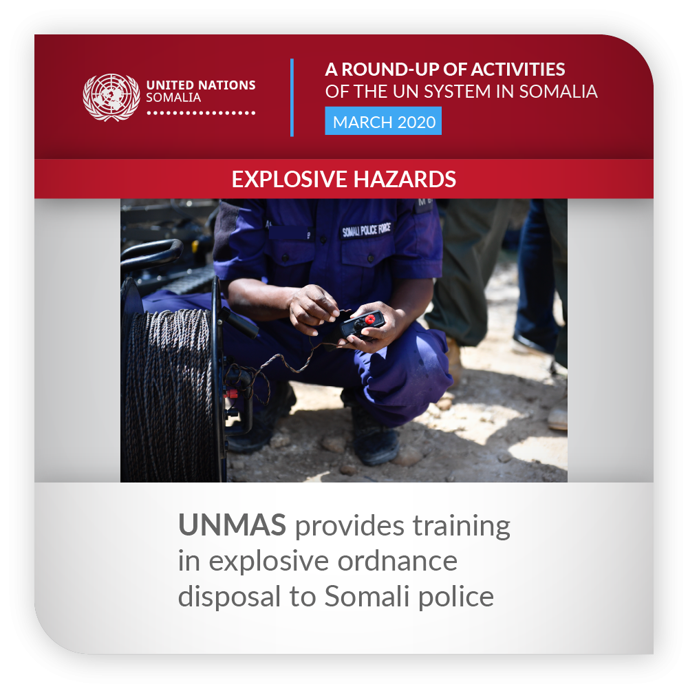 ![]() | EXPLOSIVE HAZARDS | UNMAS provided training in explosive ordnance disposal to Somali police As part of its efforts to build the capacity of Somali Police Forces to respond the threat of explosive hazards in Somalia, including improvised explosive devices (IEDs), UNMAS provided medical and technical training in explosive ordnance disposal to four teams from the Somali Police Forces from Addado, Kismayo, Baidoa and Mogadishu. | |