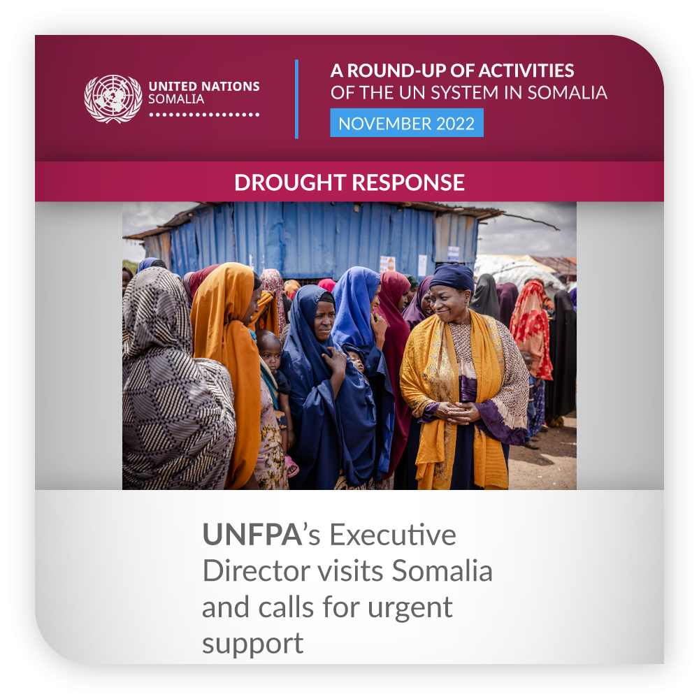 ![]() | Drought response | UNFPA's Executive Director visits Somalia and calls for urgent support The Executive Director of UNFPA, Natalia Kanem, visited Somalia and called for urgent and increased support for women and girls affected by the worst drought to have hit the country in 40 years. In a media statement, Dr. Kanem also called on the international community to fund reproductive health and the prevention and response to gender-based violence as women and girls increasingly bear the brunt of the worsening drought. The drought plaguing Somalia has led to acute food insecurity and a surge in violence. UNFPA remains committed to safeguarding access to life-saving reproductive health and protection services that are critical for the survival and well-being of women and girls. | |