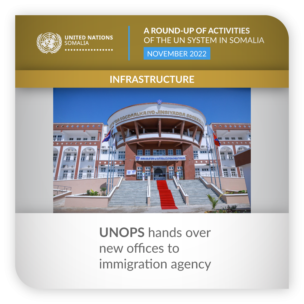 ![]() | Infrastructure | UNOPS hands over new offices to immigration agency UNOPS handed over new offices to Somalia’s Immigration and Nationalization Directorate (IND). The offices will serve as the IND’s new headquarters and will help the entity’s efforts with immigration and border control as Somalia builds back after decades of strife. The new headquarters also incorporates green technology and integrated energy and water systems. The handover event was attended by various senior Somali and international partner representatives, including Prime Minister Hamze Abdi Barre, the country’s Federal Minister of Internal Security, the IND Director General, the Police Commissioner, and the Chief Justice of the Supreme Court, as well as officials from the Danish, Finnish Norwegian and United Kingdom governments. The new offices cost $6.8 million, with the funding coming from the UK’s Foreign, Commonwealth & Development Office, and the Ministries of Foreign Affairs of Denmark, Finland and Norway, with the latter also including its Ministry of Justice among the supporting entities. | |